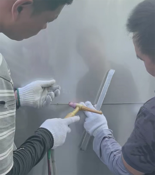 在不銹鋼儲罐工作廠區內,一臺吊車正平穩吊起一節不銹鋼罐體,緩緩靠近組裝工位。這是百森不銹鋼發酵罐生產流程中的關鍵一環——罐體組裝焊接,兩位經驗豐富的技術師傅正在對罐體對接進行錨點焊接操作,精細的協作正···